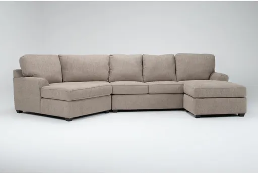 Alessandro II sectional brings oversized comfort to your living room with a soft taupe chenille that reads neutral alongside grey accents. Deep-seated, foam-filled cushions with dacron wrapped foam offer a plush initial feel without sacrificing supportive seating for long movie nights. The low-profile track arms and block base create a modern silhouette that suits casual, contemporary living room furniture. This two piece modular set includes a right arm facing sofa chaise and a left arm facing cuddler to deliver flexible lounging and family-size capacity.