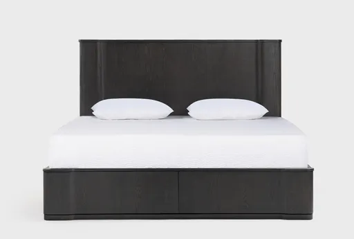 Alessio Espresso California King Platform Bed W/ Storage pairs a modern, low-profile silhouette with smart storage so a large bed doesn’t overwhelm your room. The headboard’s curved shape and soft edges create a refined focal point while the brown oak veneer and solid rubberwood frame, reinforced with furniture-grade MDF panels, provide stable everyday performance. Two deep drawers built into the platform keep linens and extras out of sight, and the California King platform offers reliable mattress support without a box spring.