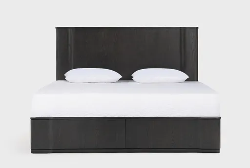 Alessio Espresso King Platform Bed W/ Storage brings modern, captain-style function to the bedroom with a clean-lined black silhouette that fits both large rooms and urban lofts. Two full-width drawers in the platform provide generous underbed storage for linens or seasonal items, and the platform slat support lets you use your mattress without a box spring. Oak veneer panels, solid rubberwood accents and MDF components offer a textured wood grain and reliable everyday durability.