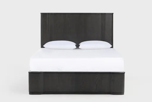 Alessio Espresso Queen Platform Bed brings a modern, pared-back presence to the bedroom with a softly curved headboard and a low-profile platform base. Oak veneer overlays a solid rubberwood frame, giving the piece a warm espresso brown look that highlights textured wood grain. The platform design supports a queen mattress without a box spring, making it an easy option for urban lofts, guest rooms or a streamlined master bedroom. Its symmetrical silhouette and rounded corners keep styling simple while still feeling contemporary and refined.