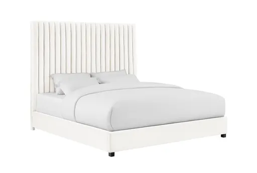 The Aleyah White Queen Velvet Channel Tufted Upholstered Platform Bed is a stunning addition to any modern bedroom. Its luxurious velvet upholstery and tall headboard with channel tufting create a sophisticated and contemporary look. Handmade by skilled artisans, this bed combines style and craftsmanship for a truly elegant piece.