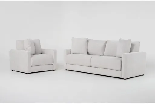 The Alicia Greige Chenille 2 Piece Sofa|Chair Set brings modern comfort to your living space. Its timeless design features soft chenille fabric in greige tones with plush, supportive cushioning. Chenille fabric upholstery, High-density foam cushioning, Loose, reversible cushions, Generous dimensions (90"W x 39"H x 39"D), Perfect for studio living spaces