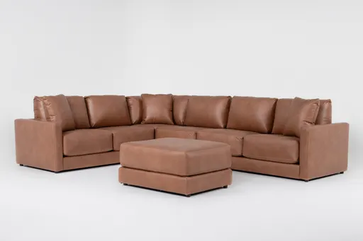 Transform your living space with the Alicia Saddle Brown Vegan Faux Leather 140" 4 Piece Sectional & Ottoman. This casual sectional offers a comfortable and spacious seating solution, perfect for family gatherings or lounging. The rich saddle brown color adds a warm and inviting touch to any room.