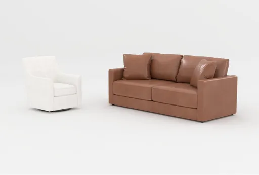 Transform your living room with the Alicia Saddle Brown Vegan Faux Leather Sofa and Belinha II Opal White Ivory Fabric Swivel Glider Arm Chair. The casual style and comfortable materials make these pieces perfect for any family room or great room. Enjoy the rich tones and functional design that these pieces bring to your home.