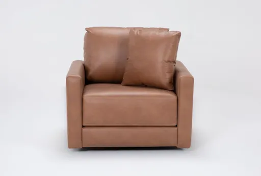 The Alicia Saddle Brown Vegan Faux Leather 40" Swivel Chair is a versatile addition to any living room or bedroom. This club chair features a comfortable loose reversible back and a saddle brown faux leather finish. It provides supportive arms and a swivel base for easy movement.