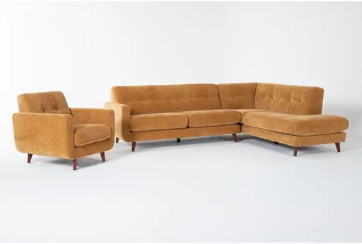 The Allie Buttercup Yellow Fabric 108" 2 Piece L-Shaped Sectional with Right Arm Facing Corner Chaise & Arm Chair offers a chic and modern design for your living room. This sectional set features track arms and tufted detailing, providing a comfortable yet firm seating experience. The buttercup yellow color adds a vibrant touch to your space, making it perfect for a lively and inviting atmosphere.