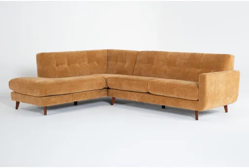 Introducing the Allie Buttercup Yellow Gold Fabric 108" 2 Piece L-Shaped Sectional with Left Arm Facing Corner Chaise. This modern sectional features tufted detailing and track arms, offering both style and comfort to your living room. Upholstered in 100% polyester fabric, the buttercup color adds a vibrant touch to your space while maintaining a firm comfort level for optimal relaxation.