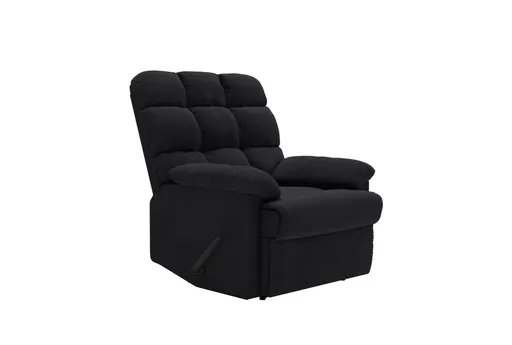 The Allister Black Recliner is a modern piece that's perfect for your living room. Upholstered in sleek black polyester, it offers both comfort and style. With its adjustable headrest and footrest, you can relax in ultimate comfort. Adjustable headrest for personalized comfort, Rolled arms add a classic touch, Durable wood frame ensures long-lasting use