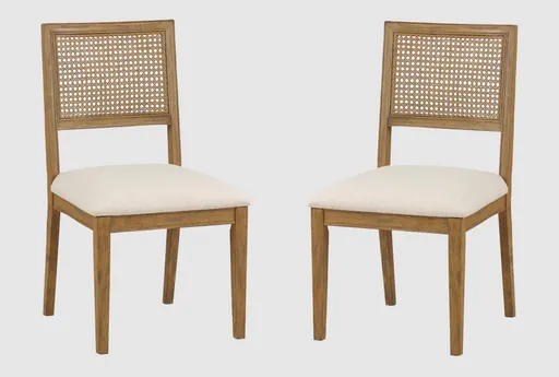 The Alna Cane Back Dining Chair Set Of 2 brings a modern touch to your dining room or kitchen with their armless design and woven cane back. These chairs are upholstered in soft, ivory polyester, ensuring comfort and durability for high-traffic areas. The set of two chairs offers a stylish and functional seating solution for any dining space.