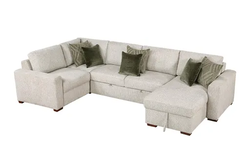 The Alonza 4 Piece Sectional with Reversible Chaise Pull-Out Bed And Hidden Storage brings versatile, lounge-ready functionality to modern living room furniture. This modular, 4 piece sectional pairs a reversible chaise and a smooth pull-out bed with a hidden storage base so you can stow blankets and pillows out of sight. Upholstered in beige polyester with foam cushions and dacron wrapped foam layers, it offers deep-seated, supportive seating that stays comfortable for long movie nights. Clean track arms, block legs and a soft edge silhouette create a contemporary profile that reads as both relaxed and refined.
