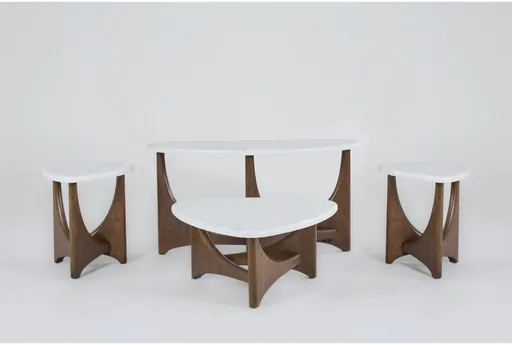 The Alphie Honed Wood 4 Piece Coffee Table Set brings a touch of mid-century modern style to your living room. This set features a unique triangular shape with a Turkish Coffee finish, complemented by a stunning marble top. Made from solid Asian hardwood, this set is both durable and stylish. Includes four pieces with a marble top. Constructed from solid Asian hardwood. Perfect for living rooms with a mid-century modern aesthetic.