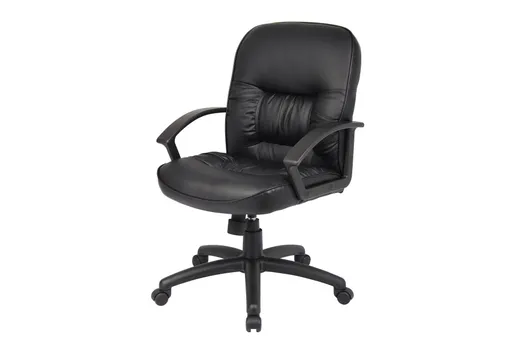 The Altura Black Leather Mid Back Executive Office Chair delivers comfortable, professional seating for your office with a padded mid-back profile upholstered in leather for everyday use. A gas lift allows quick height adjustments while the swivel base and smooth-rolling wheels make it simple to move between tasks without standing up. Built to contract grade standards, this chair pairs durability with supportive cushioning so you can stay focused through long work sessions.