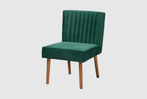 The Alvis Mid-Century Modern Dining Chair in emerald green velvet and walnut brown wood is a stylish addition to any modern dining space. Its mid-century design is complemented by a channel-tufted backrest and luxurious velvet upholstery, providing both comfort and elegance. Constructed from high-quality materials, this chair ensures durability and long-lasting use.