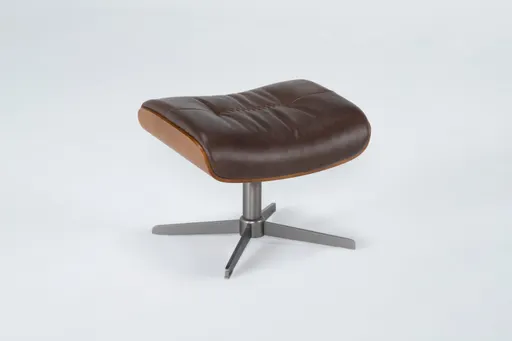 The Amala Brown Leather Wood Rectangle Ottoman is a stylish addition to any living room. Its dark brown leather upholstery and firm comfort level make it both functional and visually appealing. The ottoman's mid-century modern design is complemented by its tufted detailing and swivel base.