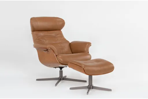 The Amala Saddle Brown Leather Reclining Swivel Arm Chair with Adjustable Headrest & Ottoman is the perfect addition to your living room or bedroom. This mid-century modern chair offers exceptional comfort with its adjustable headrest and high back, ensuring you can relax in style. The 100% top grain leather upholstery provides durability and a luxurious feel. Swivel feature for easy movement. Adjustable headrest for personalized comfort. Includes matching ottoman for added relaxation.