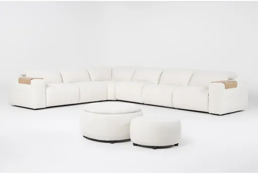 One of our most popular collections is now available with power reclining and USB charging. Meet our Amallo Ivory modular power reclining sectional and ottoman set. The luxuriously plush design invites you to get comfy and enjoy foam and feather blend cushions that set the scene for relaxing. Power headrest and power footrest capabilities allow you to adjust to the perfect position. In addition to chic tufting detail, wide track arms create a distinctive contemporary look. A wood arm tray that varies in color due to natural characteristics is the perfect perch for drinks and snacks. Nesting ottomans are a fun, cozy addition.