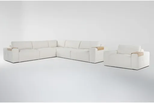 Experience the blend of comfort and style with the Amallo Ivory White Fabric 5 Piece Modular L-Shaped Sectional & Chair Set. This modern, modular design in mellow ivory adds a touch of sophistication to any living room. The fabric is 100% polyester, ensuring durability and ease of maintenance.