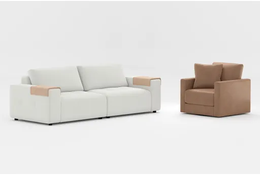 Introducing the Amallo Ivory White Fabric 108" 2 Piece Sofa and Alicia Saddle Brown Vegan Faux Leather 40" Swivel Chair, the perfect modern addition to your living room. The mellow ivory polyester fabric offers a soft comfort level, while the modular design of the sofa provides flexibility and style. The tufted detailing adds a touch of sophistication, and the swivel chair ensures easy mobility and comfort.