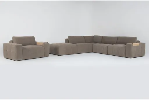 Introducing the Amallo Mocha Brown Fabric 5 Piece Modular L-Shaped Sectional with Right Arm Facing Bumper Chaise & Chair Set. This modern sectional set features a mellow mocha color that brings a warm, inviting feel to your living room. The firm comfort level ensures lasting support, perfect for family gatherings or relaxing after a long day.
