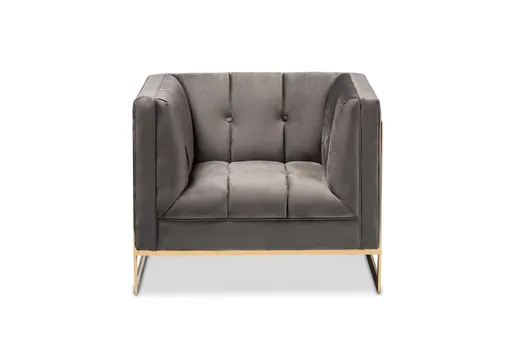 Ambra Glam and Luxe Grey Velvet Fabric Upholstered and Button Tufted Armchair with Gold-Tone Frame brings a glam, tailored presence to the living room with grey velvet upholstery and button tufting that keeps the seat and back looking neat. The plywood frame and foam cushions offer comfortable, reliable support for reading or relaxing, while the gold-tone metal base lifts the profile and provides stable support. Use this armchair to anchor a contemporary seating area or create a polished reading nook that feels both inviting and refined.