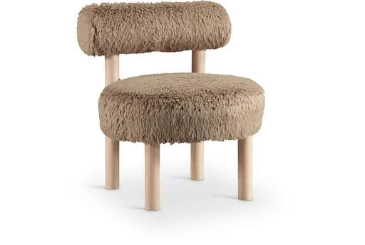Ambre Tan Vegan Shearling Fabric Upholstered Accent Chair brings a cozy, design-forward presence to your living room with a plush, rounded seat and padded back. Upholstered in tan vegan shearling fabric, the chair pairs cloud-like foam cushioning with a sturdy rubberwood base for reliable support. Its compact, armless silhouette and low profile make it easy to position in small seating areas while offering comfort-forward support for reading or entertaining. The result is a versatile accent chair that balances tactile comfort with durable construction for everyday use.