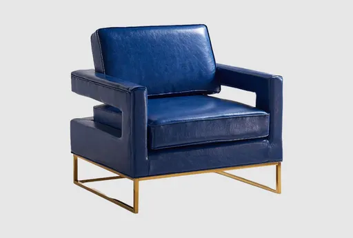Amelia Navy Vegan Leather Accent Chair brings modern elegance with its sleek design and luxurious navy faux leather upholstery atop an elegant gold stainless steel base. 100% polyurethane material, also known as pleather or artificial leather. Comfortable 19" seat height. Attached cushion design. 33"W x 35"H x 29"D. Perfect for living room spaces with its fake leather luxury look.
