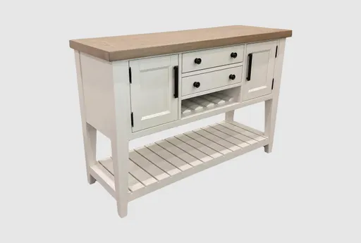 The Amery White + Brown Two Tone Wood 2 Drawer 2 Door 54" Dining Buffet with Wine Rack is a versatile addition to your dining room or kitchen. Crafted with a combination of poplar solids and birch veneers, this buffet offers both durability and style. The white and brown two-tone finish adds a touch of sophistication to any space.