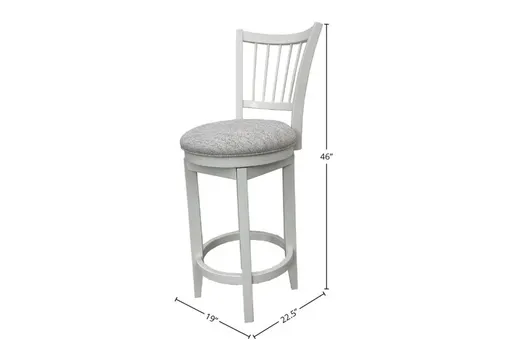 Introducing the Amery White + Grey Upholstered Seat Wood Spindle Back 30" Swivel Barstool. This armless barstool blends comfort and style, making it a perfect addition to your dining room or kitchen. The cotton-colored fabric seat complements the sturdy wood construction, ensuring durability and a timeless look.