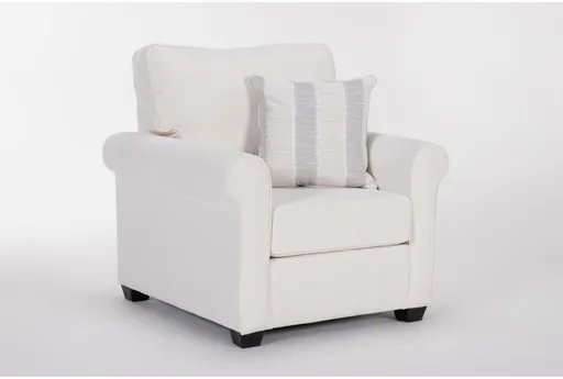 Add a touch of classic style to your living room with the Amora Ivory White Fabric Arm Chair. This traditional armchair features a soft Dickenson Ivory color and comfortable rolled arms for a timeless look that complements any decor.
