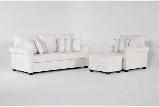 Enhance your living space with the Amora Ivory White Fabric 3 Piece Sofa Arm Chair & Ottoman Set. This traditional set, upholstered in Dickenson Ivory fabric, provides both comfort and style. Perfect for family rooms or great rooms, it includes a sofa, armchair, and ottoman, all featuring accent pillows for added coziness.
