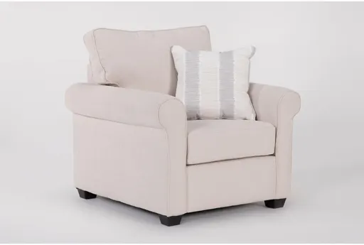 Introducing the Amora Sand Beige Fabric Arm Chair, a perfect blend of traditional style and modern comfort. This arm chair is designed to enhance your living room with its soft, neutral color and inviting rolled arms. The Dickenson Sand fabric, made from 100% polyester, ensures durability while providing a cozy seating experience.