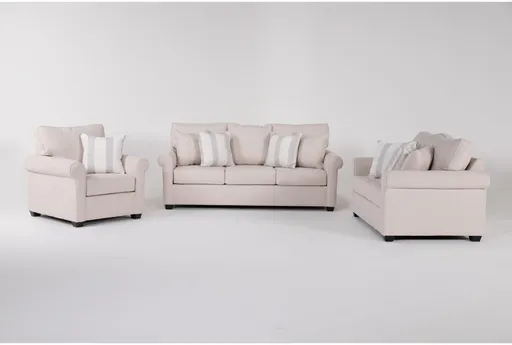 Transform your living room with the Amora Sand Beige Fabric 3 Piece Sofa Loveseat & Arm Chair Set. This traditional set is upholstered in Dickenson Sand fabric, providing a neutral tone that complements any decor. Made from 100% polyester, it offers durability and easy maintenance. Includes sofa, loveseat, and armchair. Accent pillows included for added comfort. Constructed with alder wood for sturdy support.