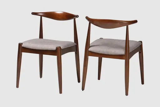 Enhance your dining space with the Amy Light Grey Fabric Upholstered + Walnut Finished Wood Dining Chair Set of 2. These modern, armless chairs feature a soft light grey fabric and a sturdy walnut-finished rubberwood frame.