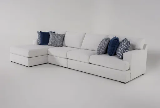Designed and made exclusively by Living Spaces with comfort, style and practicality in mind, our Anacapa sectional checks all the boxes. Modular in nature, you'll find small and large configurations to fit your space perfectly. Deep and plush seating is hard to resist, while accent pillows add all that jazz and pizzazz with a timeless blue palette you'll love. Best of all, the high-performance, solution-dyed polyester cover is durable, bleach cleanable and fade resistant.