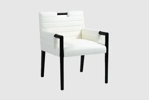 The Analee White Vegan Leather Fabric Dining Arm Chair with Black Legs is a stylish addition to any dining room or kitchen. This modern club chair features a sleek design with a soft cream color and sturdy black rubberwood legs. Its vegan leather upholstery offers a comfortable and animal-friendly seating option.