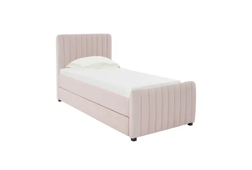 The Anaya Blush Twin Upholstered Panel Bed with Twin Trundle is a perfect blend of mid-century modern and contemporary design. Crafted with a soft blush velvet fabric, this twin-sized bed offers both style and functionality, featuring a convenient rolling trundle for additional sleeping space. Handmade by skilled furniture craftsmen, it ensures durability and elegance in any bedroom setting.