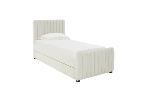 The Anaya Cream Twin Upholstered Panel Bed with Twin Trundle is a perfect blend of mid-century modern and contemporary design. Crafted with a soft velvet fabric, this bed offers a luxurious feel and a stylish look. The included trundle provides an additional sleeping space, making it ideal for kids or guests.