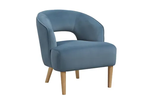 The Anaye Blue Accent Chair brings sculptural comfort to compact rooms with a curved back that creates a cozy, conversation-starting silhouette. Upholstered in soft fabric with a plush seat cushion wrapped in dacron and high-resilience foam, it offers supportive seating that maintains its shape over time. Tapered wood legs in a natural finish add a light visual presence and mid-century modern charm while supporting structural integrity. With a symmetrical profile, recessed arms, and a compact footprint, this chair is a smart modern living room furniture option and a true small space solution for apartments and bedroom nooks.