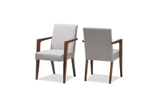The Andrea Mid-Century Modern Greyish Beige Upholstered Wooden 2-Piece Lounge Chair Set pairs a classic mid-century modern silhouette with everyday comfort for your living room. Each chair is upholstered in 100% polyester fabric with foam cushions that hold their shape, while tapered rubberwood legs and mixed wood and MDF support provide stable seating. The wooden arms and compact footprint make this matched pair ideal for conversation areas, reading nooks, or supplementing a sofa arrangement.