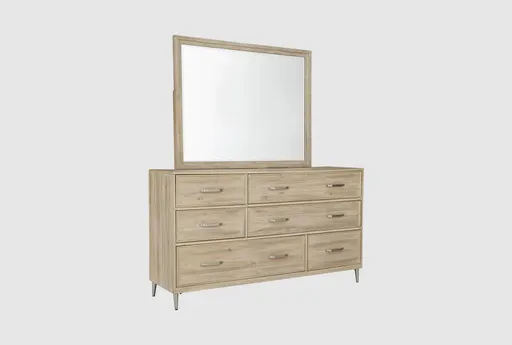 The Andrew 6-Drawer Dresser/Mirror in Biscotti offers a perfect blend of modern and coastal styles, making it a versatile addition to any bedroom. Crafted from acacia wood and select veneers, this dresser features a soft, neutral color that complements a variety of decor themes. The dresser is designed with functionality in mind, featuring felt-lined top drawers and cedar-lined bottom drawers for optimal storage.