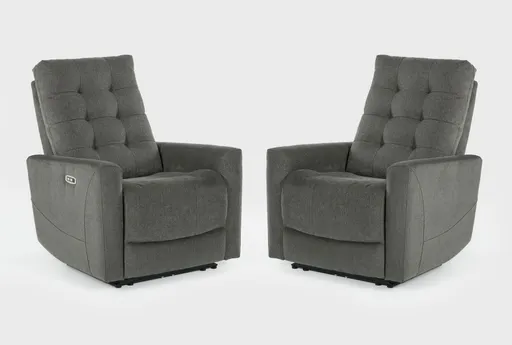 Ansel Grey Fabric 33" Power Recliner With Usb Set Of 2 puts power reclining convenience and everyday comfort together in a compact package for modern living room furniture. Upholstered in a smooth grey fabric with a tufted divided back, these chairs pair a contemporary silhouette with track arms for a clean profile that works well in apartment-size and small space solution scenarios. The set includes two power recliners with integrated USB ports and a responsive power recline mechanism so you can adjust head and neck support and footrest position with the push of a button. Foam cores wrapped in dacron and supportive seat layers deliver a plush yet stable feel for long movie nights or casual lounging.