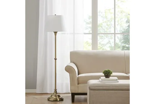 Bring warm, ambient light to tight corners with the Athena Floor Lamp. Its antique brass metal stem and round pedestal create a contemporary presence while keeping a slim profile for small space solution needs. A white fabric cylinder shade softens illumination for reading and background lighting, making this floor standing piece versatile for living rooms, bedrooms, entryways and offices. The vertical, 59 inch height positions light over seating without the bulk of a larger fixture.