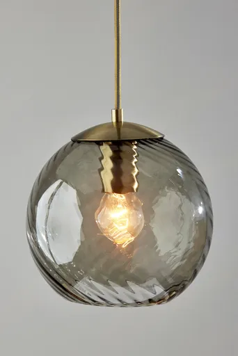 Enhance your living space with the 9" Antique Brass + Swirled Smoke Glass Pendant. This modern light fixture features a stunning antique brass finish and a unique swirled smoke glass shade, making it a perfect addition to any room. Ideal for dining areas, kitchens, and living rooms, this pendant light exudes vintage style, especially when paired with an Edison bulb (not included). For added versatility, pair it with a compatible wall dimmer to create the perfect ambiance.