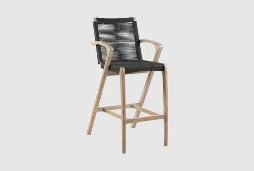 The Apola Natural Outdoor Counter Stool is a modern, tall stool with a back, designed for both indoor and outdoor use. Made from eucalyptus wood and dolomite, it features a unique fishbone style rope weave and a comfortable pillow top in a dark grey color. This patio piece will elevate your outdoor space.