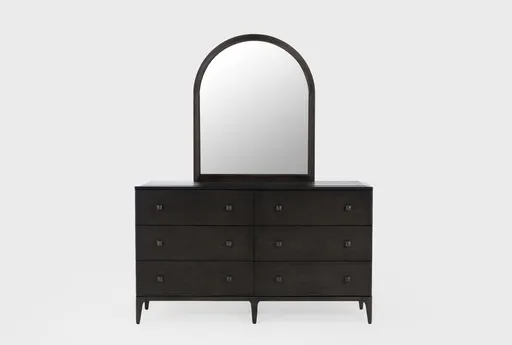 Thoughtfully designed and carefully developed by Living Spaces, our Apolo 6-drawer dresser with mirror introduces classic style with a minimalist twist. Striking a balance between refined form and graceful details, the set offers a modern traditional look and feel. You'll relish the softened elements and clean, airy elegance. Solid wood and oak veneer are decked in a rich dark brown finish that lends depth and texture, while diamond shaped hardware reveals a subtle patina.