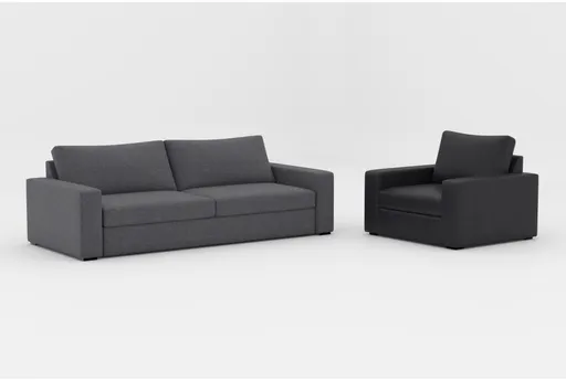 Introducing the Araceli II Pewter Grey Fabric 95" Queen Memory Foam Sleeper Sofa Bed and the Araceli II Charcoal Grey Vegan Faux Leather Oversized Chair. This modern set combines comfort and style, perfect for any living room. The queen-sized sleeper sofa features a memory foam mattress for ultimate relaxation, while the oversized chair offers plush seating.