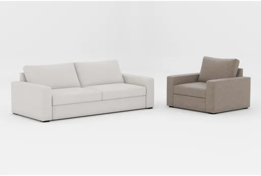 Introducing the Araceli II Sand Beige Fabric 86" Sofa and Araceli II Taupe Beige Vegan Faux Leather Oversized Chair, perfect for your modern living room. These pieces combine comfort with contemporary style, featuring track arms and a soft, neutral color palette. The sofa and chair provide a cozy seating experience with their plush cushions and durable materials.