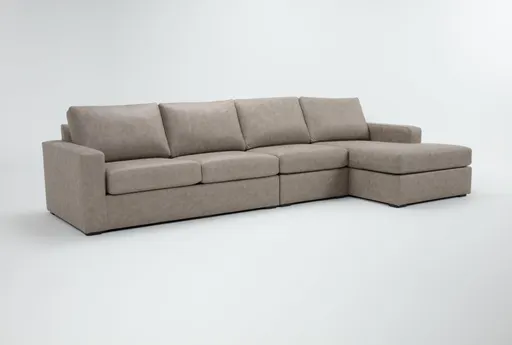 The Araceli II Taupe Beige Brown Vegan Faux Leather 3 Piece Sectional with Right Arm Facing Chaise is a perfect addition to any modern living room. Its large size and comfortable design make it ideal for family gatherings or relaxing after a long day. The right arm facing orientation and L-shaped configuration offer versatile seating options.