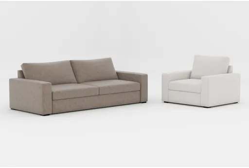 Introducing the Araceli II Taupe Beige Vegan Faux Leather 95" Sofa and Sand Beige Fabric Oversized Arm Chair. These modern pieces are perfect for your living room, offering both style and comfort. The sofa features a taupe faux leather finish, while the arm chair is upholstered in sand beige fabric, both designed to complement any decor.