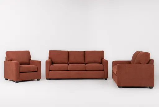 The Aramis II Cinnamon 3 Piece 83-inch Queen Sleeper Sofa, Loveseat & Chair Set delivers casual comfort for everyday living, pairing a matching sofa, loveseat and chair upholstered in cinnamon fabric. The sofa easily converts to a queen-size sleeper for overnight guests, and the durable 100% polyester upholstery stands up to high-traffic living room use. Supportive seat and back cushions sit on a sturdy frame to provide comfortable seating for family time and entertaining. This coordinated set helps simplify furniture selection while giving your living room a pulled-together feel.